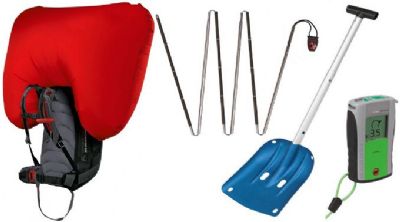 Der Lawinen-Überlebensrucksack (l.): Innert drei Sekunden bläst sich der Airbag zu einem vollen Volumen von 150 Litern auf.