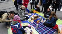 Abermals jedoch war die Stimmung bunt und friedfertig. Bilder und Slogans wurden mit farbigen Kreiden auf den Boden gemalt, in einer Ecke trommelte ein älterer Mann selbstvergessen auf einer kleinen Handtrommel, mitten auf dem Platz sass eine Frau, ein Schild in den Händen mit der Feststellung «Wir sind die 99%». Die Polizei hielt sich im Hintergrund.